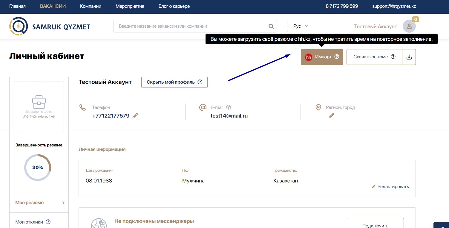 Чтобы импортировать Ваше резюме с hh.kz, Вам нужно зайти в свой личный кабинет на сайте hh.kz