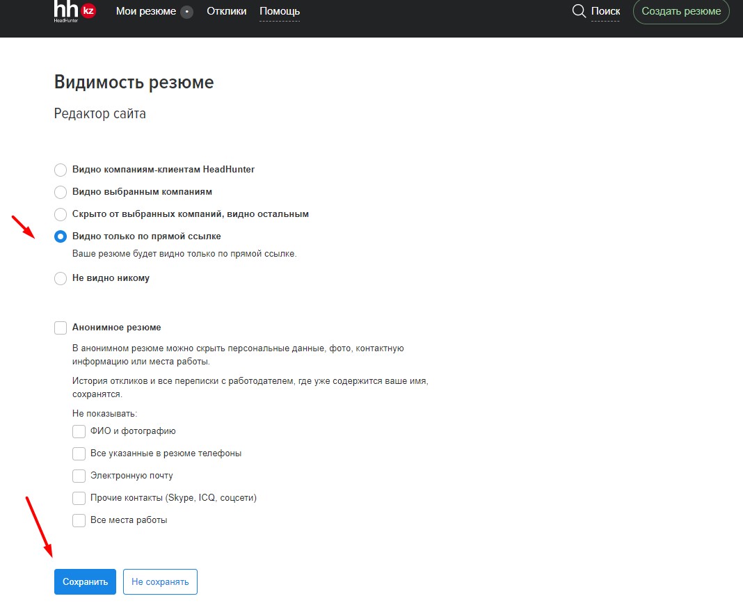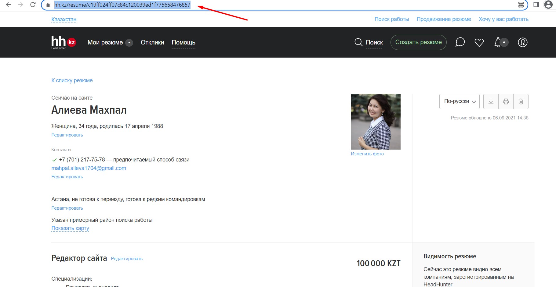 После этого возле Вашего резюме на сайте hh.kz появится статус «Доступно только по прямой ссылке» - скопируйте эту ссылку.